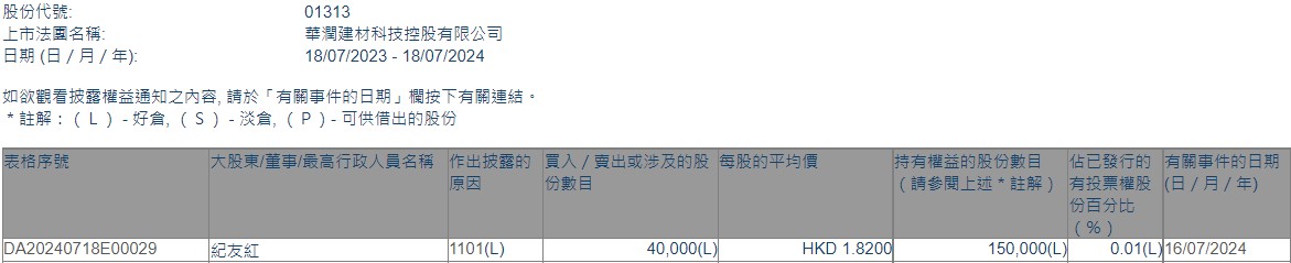 香港联交所最新资料显示,7月16日,董事会主席纪友红增持华润建材科技(01313)4万股,每股作价1.82港元,总金额7.28万港元。增持后最新持股数目15万股,最新持股比例0.01%。
