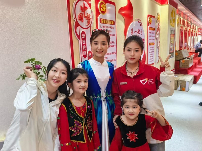 图为张祎明参演当地话剧《沙漠玫瑰绽放之路》后,与剧中原型人物留下合影,定格服务中的文化共鸣时刻。