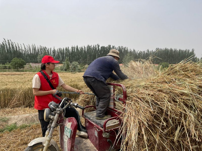 图为侯兆旭深入当地田间,主动助力困难农户麦收。