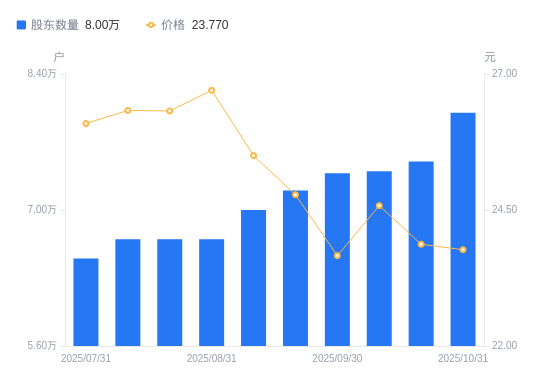 近一年(2024年10月31日至2025年10月31日),北新建材A股股东户数从4.8万户,增加至8万户,增幅66.67%,区间股价下跌20.75%。